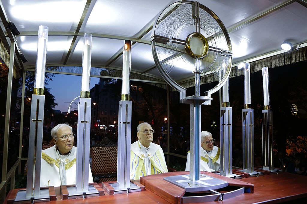 Percorrendo il centralissimo Viale Andrassy in tutta la sua lunghezza, il corteo è giunto, dopo 4,5 chilometri, a Piazza degli Eroi. In un’ora e mezza la testa della processione era giunta alla meta ma la coda di popolo stava ancora lasciando Piazza Kossuth. Al centro della devozione il carro speciale con l’Eucaristia collocata nel grande ostensorio di mt. 1,60, ai cui piedi erano inginocchiati il cardinale arcivescovo, il presidente del Pontificio Comitato per i Congressi e il Nunzio apostolico. La processione, illuminata da migliaia di fiaccole, si è ingrossata procedendo man mano, tra due devote ali di folla. Oltre duecentomila i partecipanti, tra preghiere e canti; decine di migliaia i giovani. L’intensa partecipazione, è stata favorita da una organizzazione perfetta, ben calibrata, con una sonorizzazione distesa lungo tutto il percorso che trasmetteva in diretta canti e preghiere le cui parole apparivano sui grandi schermi innalzati sopra il viale, a distanza di poche centinaia di metri l’uno dall’altro. La benedizione conclusiva con il SS. Sacramento è stata seguita come sempre dal canto dell’inno del Congresso, con cui si è sciolta dell’assemblea.
